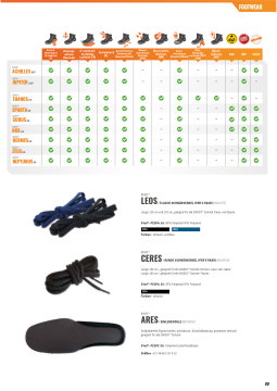 FOOTWEAR Schock- dämpfung im Fersenbereic (E) Atmungs- aktives Oberleder öl- und benzin- beständige Laufsohle (FO) Antistatisch (A) Durchtrittsichere Zwischensohle (Kunststoff/Stahl) Wasser- abstoßendes Oberleder (WRU) Wasserdichte Membran (WR) Hitze- Zehen- beständige schutzkappe (Kunststoff/Stahl) Laufsohle (300°) (HRO) Wärme- Isolierung (WR) ESD SRC DGUV e r t i f i z i e r t g e m ä ß z DGUV 112-191 Secosol© b a u m u t s t e r g e p r ü f n a c h DASSY® ACHILLES S1P DASSY® JUPITER SPARTA S1P DASSY® THANOS S3 DASSY® DASSY® CORUS S3 NOX S3 DASSY® HERMES S3 ZEUS S3 S3 DASSY® DASSY® DASSY® NEPTUNUS S3 DASSY® LEOS / FLACHE SCHNÜRSENKEL (PER 5 PAAR) \[800075\] Länge 120 cm und 150 cm, geeignet für die DASSY® Schuhe Corus und Sparta Stoff - PESPA 65: 65% Polyester/35% Polyamid 0704 0843 Farben - schwarz, azurblau DASSY® CERES/ RUNDE SCHNÜRSENKEL (PER 5 PAAR) \[800063\] Länge 130 cm - geeignet für die DASSY® Schuhe Hermes, Zeus und Jupiter Länge 150 cm - geeignet für die DASSY® Schuhe Thanos Stoff - PESPA 65: 65% Polyester/35% Polyamid 0704 Farben - schwarz DASSY® ARES / EINLEGESOHLE \[800055\] Antibakterielle Eigenschaften, antistatisch, Schockdämpfung, paarweise verkauft, geeignet für alle DASSY® Schuhe Stoff - PESPE 50: Polyester/Latex/Polyäthylen Größen - EU 36-48 | UK 3-13 99